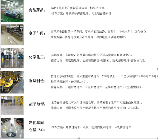 根據材料及施工工藝可分為:干撒式耐磨地坪(金剛砂)、液體耐磨地坪(混凝土密封固化劑)、環氧樹脂地坪、聚氨酯耐磨彈性地坪、乙烯基重防腐等。